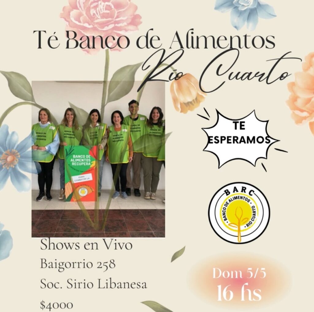 Hola!!!👋, Te invitamos al Te anual de Banco de Alimentos de Rio Cuarto. Tendrá lugar el domingo 5/5, a las 16 hs, el La Soc Sirio Libanesa (Baigorria 258), valor de la entrada $4000. Para obtener tu entrada comunicate con nosotros. Podes transferir o pagar en efectivo. Este año tendremos shows en vivo de Taconeo Español, Bingo, Danzas Contemporáneas y mucho más. Sumate a la cadena que alimenta.